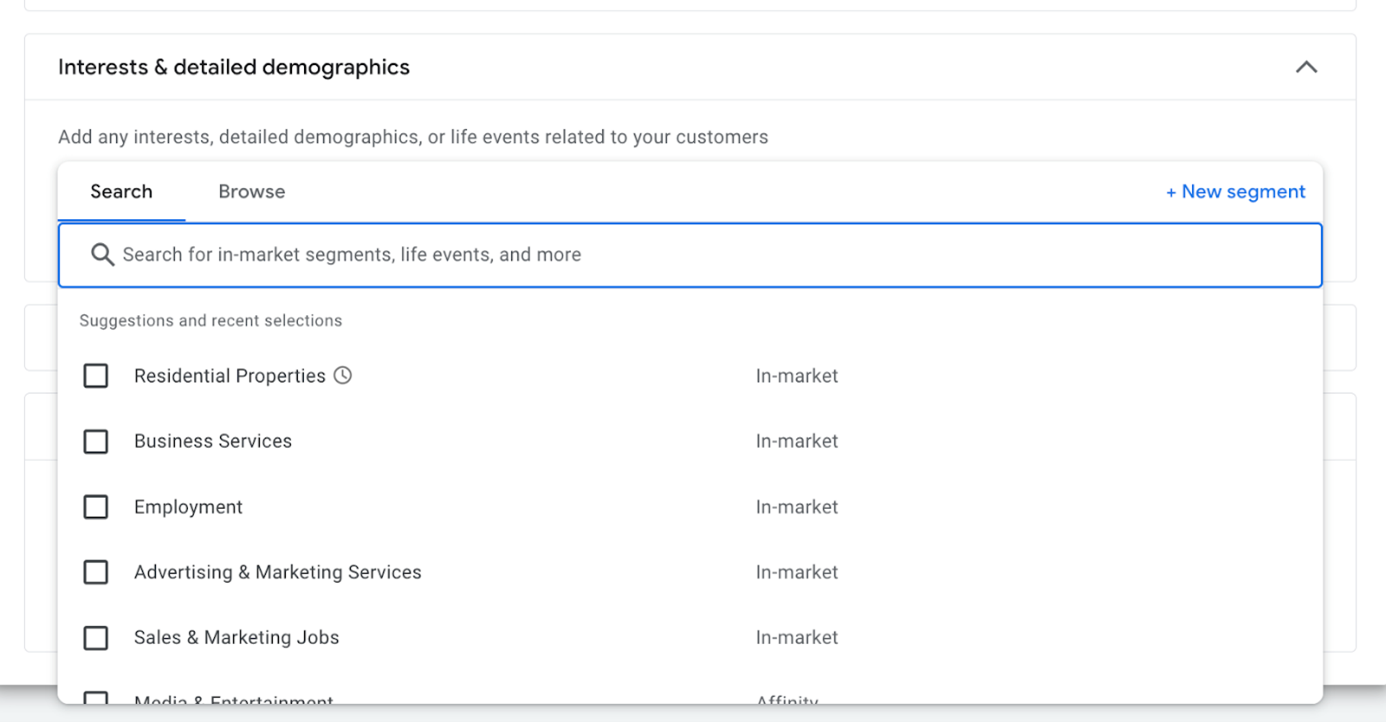 PRO Tip: targetarea în funcție de istoricul de browsing sau de căutare în Google. La nivel de segmente există și opțiunea de a construi o audiență custom. În acest caz poți targeta în funcție de site-urile pe care userii le-au vizitat (aici poți adăuga competiția ta directă, de exemplu) sau în funcție de istoricul de căutare în Google. Pentru istoricul de căutare îți recomand cuvinte cheie specifice prin care să identifici interesul pentru achiziția produselor sau serviciilor pe care tu vrei să le promovezi. De asemenea, această opțiune este una care poate aduce rezultate foarte bune pentru campaniile pentru un SaaS cu o audiență limitată.